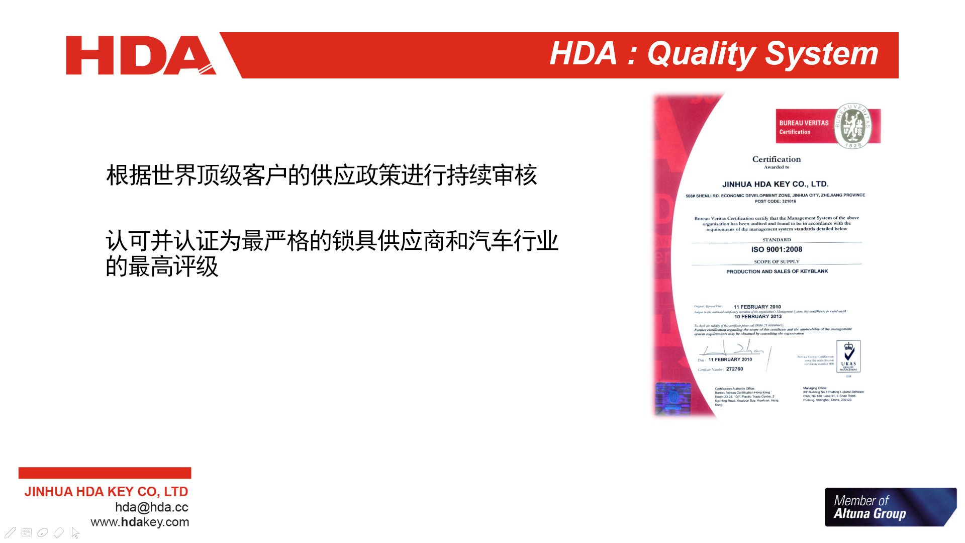 金華宏達(dá)鑰匙有限公司(簡稱HDA)位于浙江省金華市經(jīng)濟(jì)開發(fā)區(qū)。工廠距離上海2小時(shí)高鐵車程,毗鄰的義烏小商品城。自90年代初建立以來,HDA已擁有二十多年生產(chǎn)和開發(fā)鑰匙的經(jīng)驗(yàn)。HDA是一家擁有上萬種原版產(chǎn)品的專業(yè)廠家,年產(chǎn)能約兩億條...